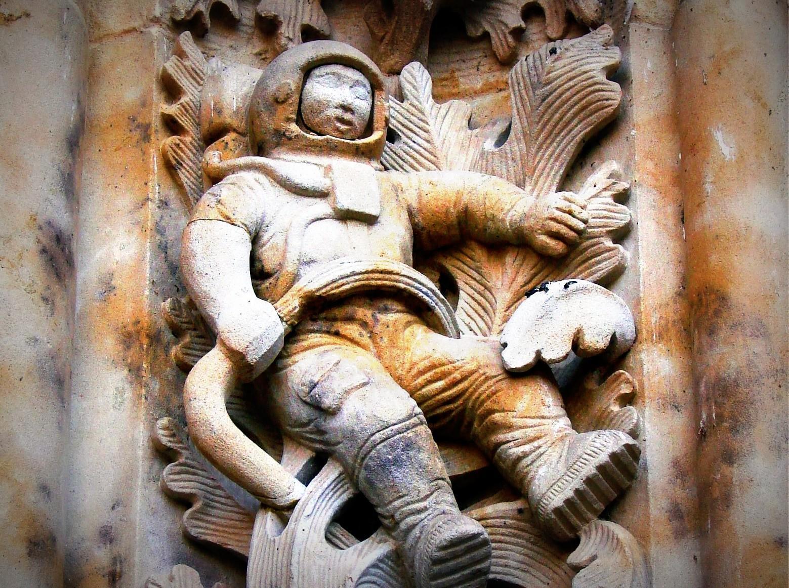 Il faut s’imaginer un type planqué derrière les plastiques de son échafaudage et secoué de petits rires à l’idée de la blague monumentale qu’il est en train d’adresser à la Terre entière : Sculpter un astronaute sur le portail de la cathédrale de Salamanque.